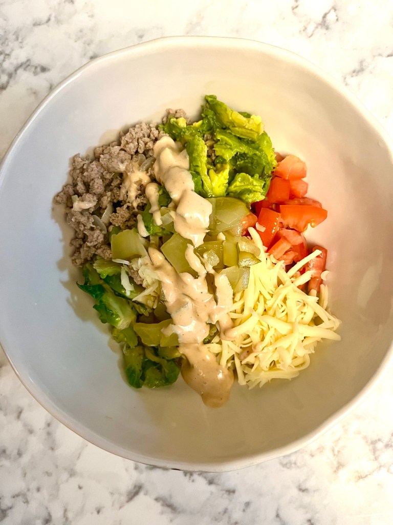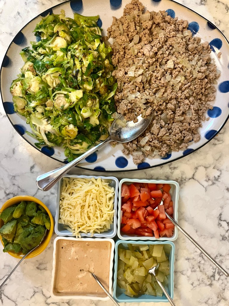 Start by sautéing ground turkey with chopped onion, a few dashes of worchestershire, garlic, onion powder, and celery salt. Once it’s browned, set aside. Then use the same pan to sauté shredded brussels sprouts in olive oil with some salt and pepper. Now it’s all about your toppings. I used shredded swiss cheese, chopped pickles, chopped tomato, chopped avocado, and comeback sauce. (Comeback sauce is mayo, ketchup, hot sauce, worchestershire, garlic powder, and black pepper.)