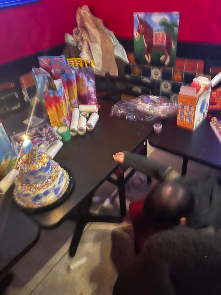 - The Food: Because of the timing of the party, we didn’t need to do a true meal. Instead, we got some chips and guac and some quesadillas/fajitas cut small to share. Adults could order whatever they wanted from the bar, and of course we had cake. (Turns out Finn is NOT into the attention. The minute the singing/candle started, he lost his mind. He swatted everything off the table and hid with his head down on a chair. I then realized that when I joined his mini party at school the day before, he quietly walked away during the birthday song. Not his thing and I can totally respect that. Eating the cake? Now that he loved.)