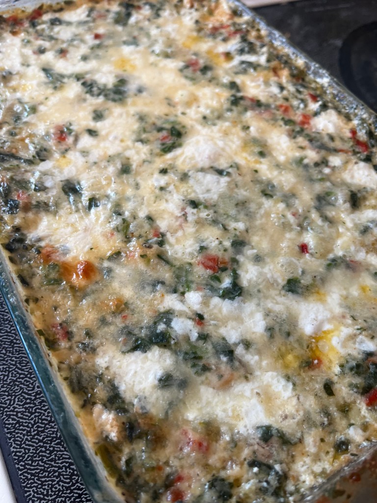 When my SIL requested apps as our contribution to the Christmas meal, I needed something easy to transport, given the 2-hour journey. Skewers are ultra easy to prep, package, and unload so that was a no-brainer. But then I instantly went to a dip. Dips are often very easy to prepare in advance and even if they’re served warm, they typically only need to go in the oven for a few minutes so they won’t be taking up valuable cooking space in your host’s home. This recipe for spinach dip that pivots from the typical artichoke had been saved on my Pinterest board for quite a while and I was thrilled to finally try it out.
