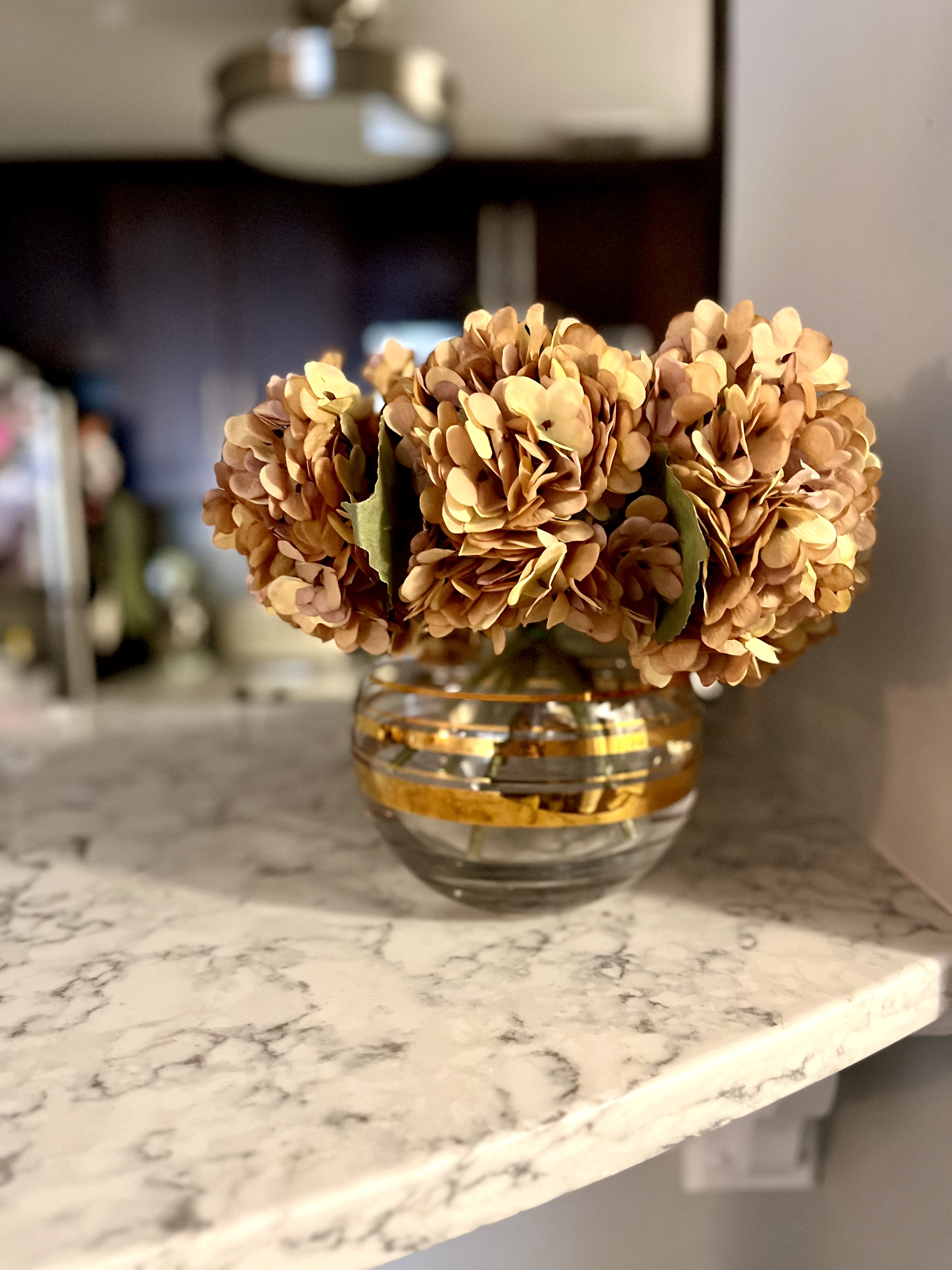 After seeing an influencer post about some faux hydrangeas that cost a mere $16, I promptly added them to my Amazon cart. They’re not the most realistic, but they’re not terrible and they add some needed dimension to that side of the bar. It also means I get to use a vase we received for our wedding that is a more difficult shape to fill. And it got me to clean up the catchalls that the vase replaced. Those catchalls were initially meant to be a key drop, but for…years…have housed random bits and bobs (a roll of washi tape, a keyless keychain, a usb cord) that haven’t actually been used. If it’s no longer serving a function (and the function could be “being pretty,” but this catchall wasn’t doing that), it’s no longer serving me and it’s time to go.