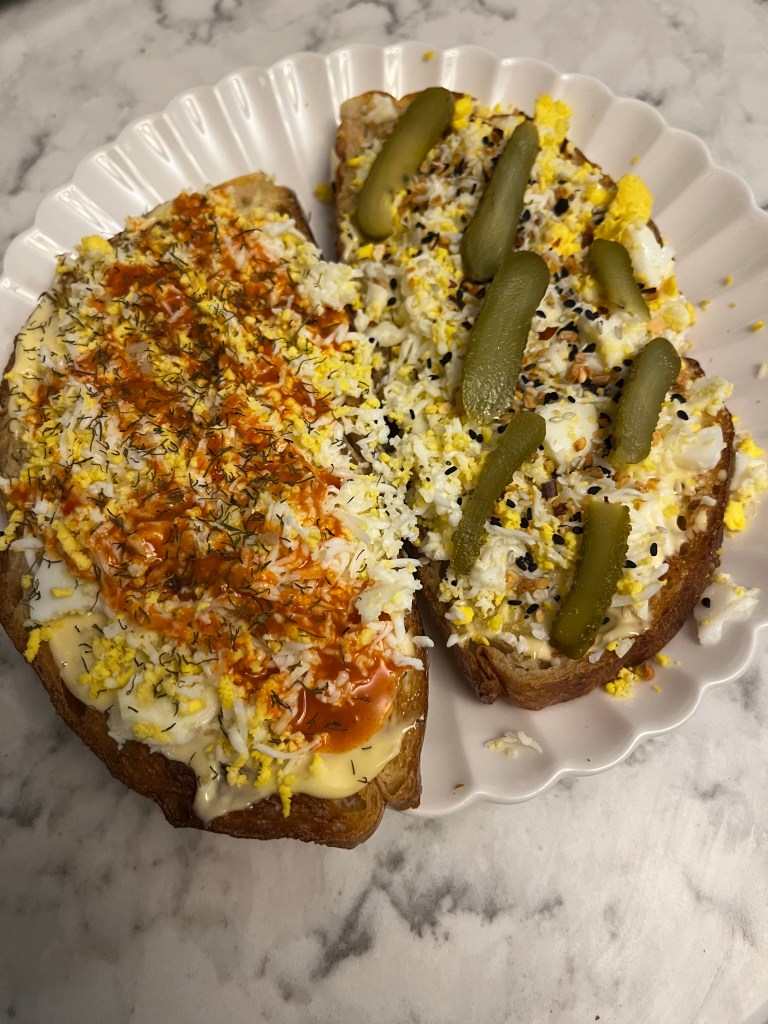 Grating your hard boiled eggs really is the way to go. I know most of the videos on TikTok do this on avocado toast, but I don’t even think you need the avocado. Toasted sourdough + kewpie mayo + grated egg + whatever seasoning you like is perfect. Sriracha? Dill and pepper? All good and super satisfying as a WFH lunch.