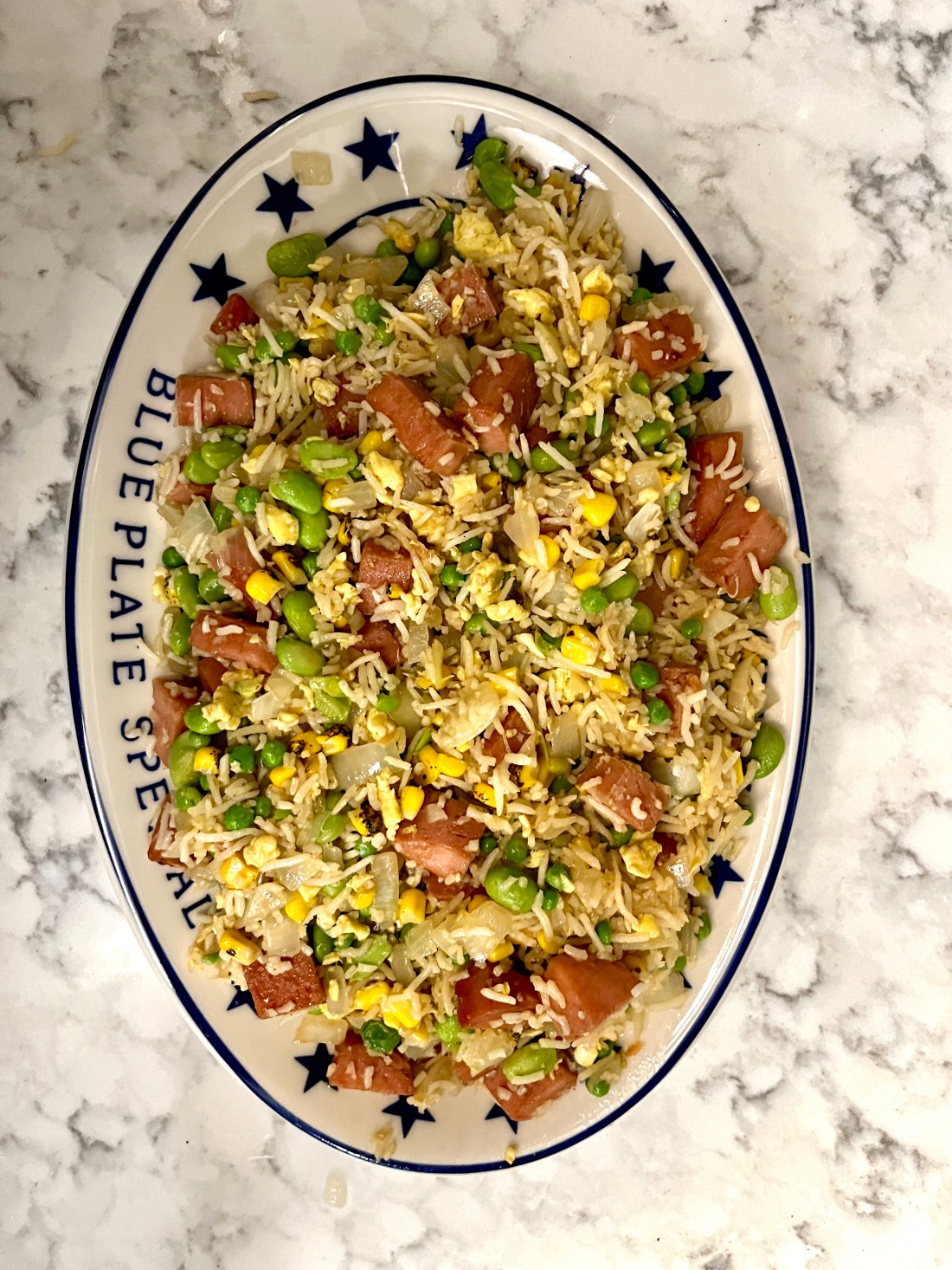 The platter of fried rice was massive and we dang near polished it off because it was just that good. From tv to table we made this meal happen. Congrats, Spam, your advertising very much worked.