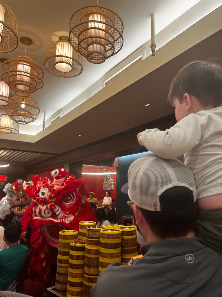 One of V’s favorite books right now is Dim Sum Palace so on Sunday we decided to take him to Chinatown to enjoy the meal he’d been hearing so much about. We went to my favorite, Jing Fong, which looks different in their new, smaller location but is every bit as yummy. Though Lunar New Year was the previous weekend, they still had some celebrations and Finn loved seeing the dragons walk through the restaurant to the sound of drums.