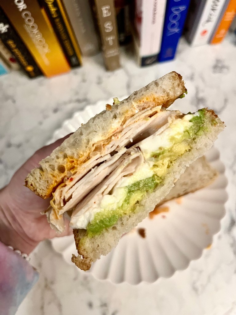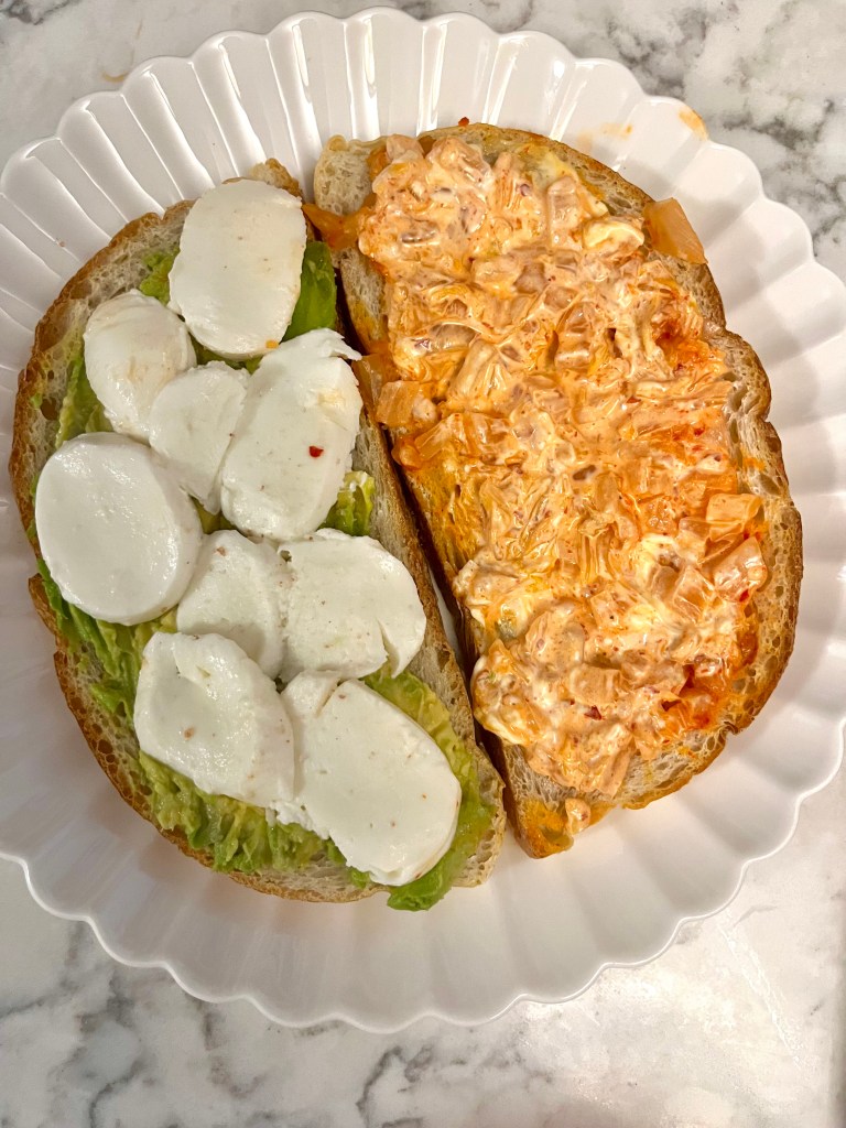Toast up some sourdough and on one side, mash an avocado (I used a little less than 1/2) and on the other spread some kimchi mayo. To make the kimchi mayo, simply chop up some kimchi and mix it into mayo (I use Duke’s). To the avo side, add some fresh mozzarella slices. I used some local mozz that was just fab. Grind some pink salt on that side, add some deli turkey, close the whole thing up, and enjoy.