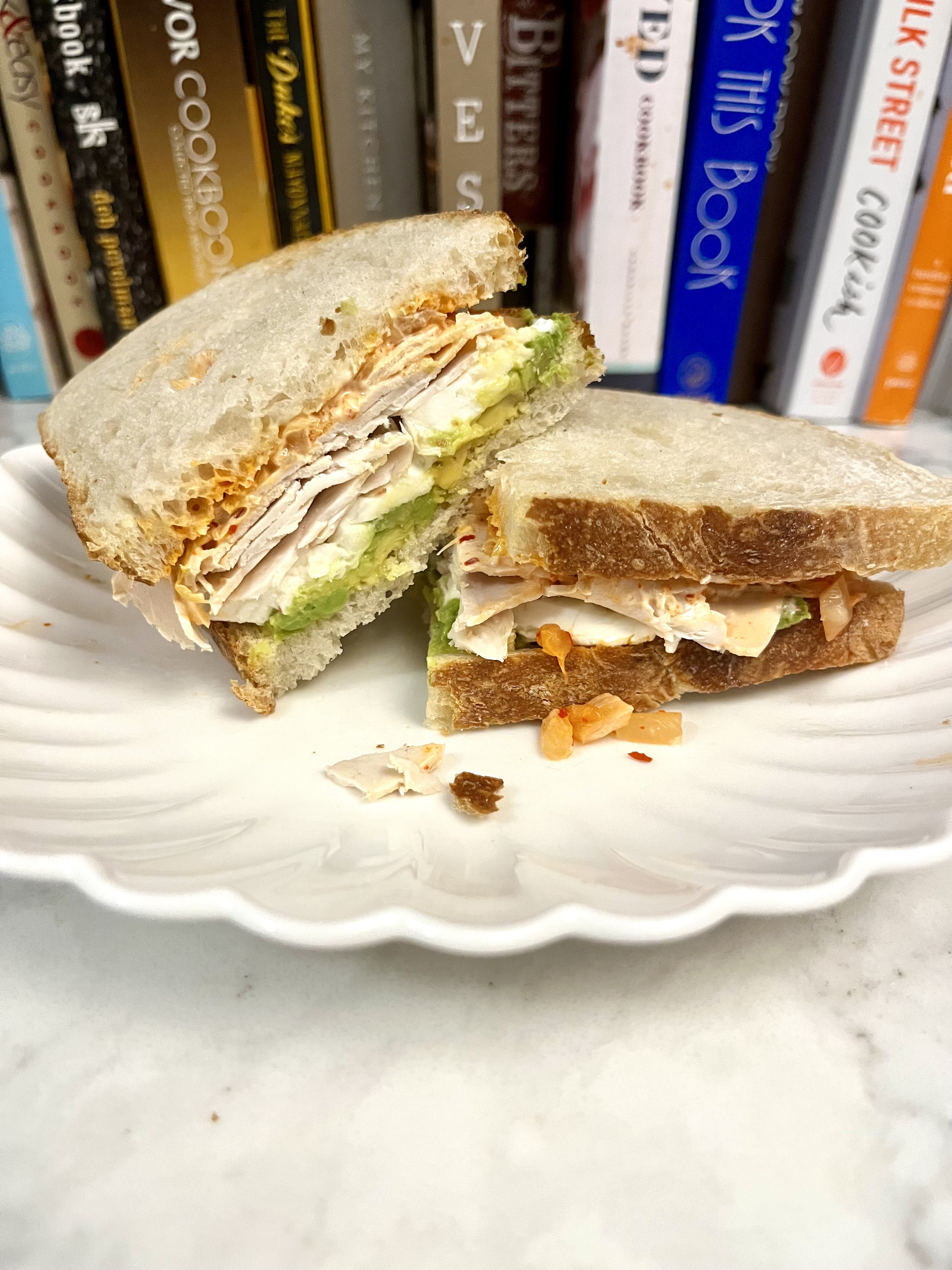 Toast up some sourdough and on one side, mash an avocado (I used a little less than 1/2) and on the other spread some kimchi mayo. To make the kimchi mayo, simply chop up some kimchi and mix it into mayo (I use Duke’s). To the avo side, add some fresh mozzarella slices. I used some local mozz that was just fab. Grind some pink salt on that side, add some deli turkey, close the whole thing up, and enjoy.