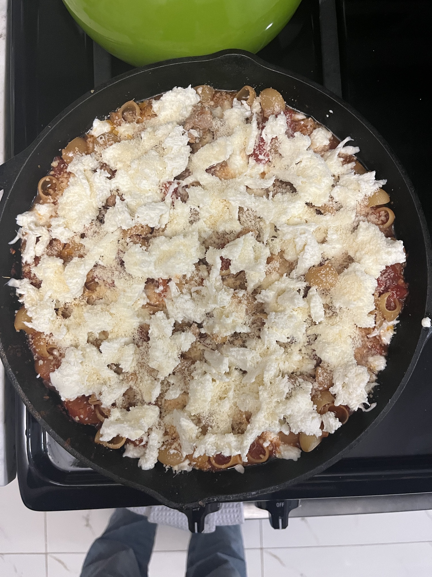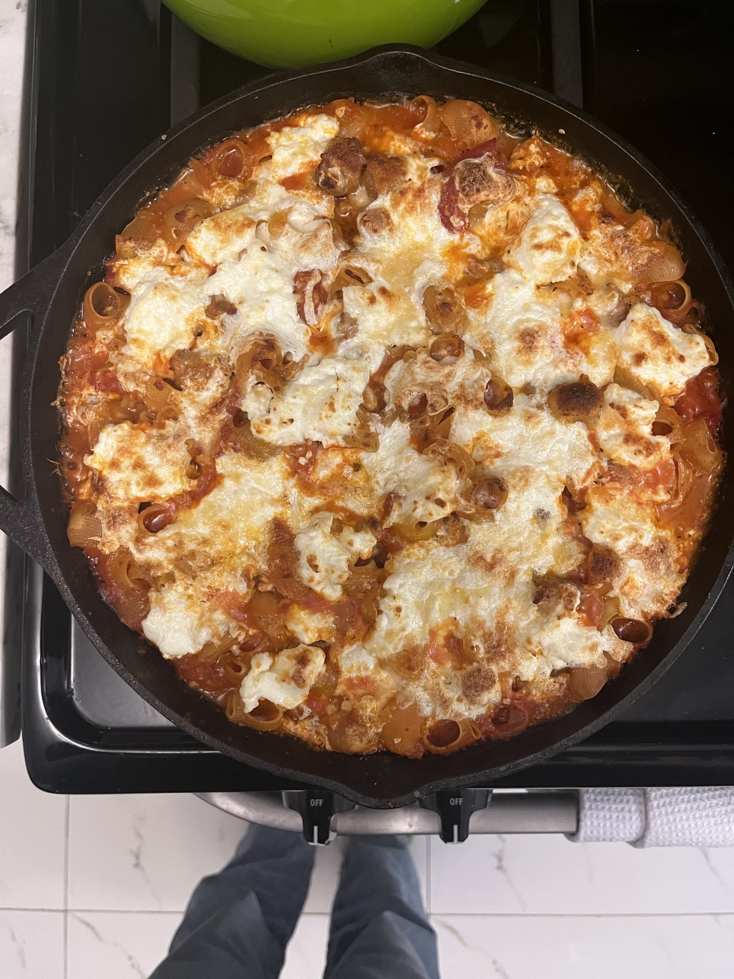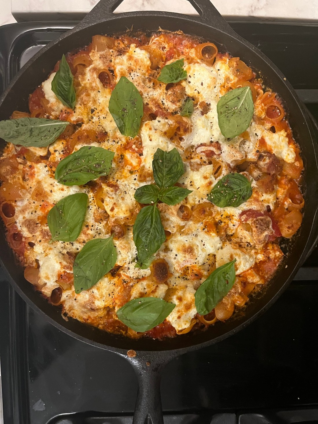 Heat oil in a cast iron skillet and crumble in 3/4 – 1 lb of Italian sausage, using a wooden spoon to break it up, and cook until it’s just browning. Stir in 4 cloves of minced garlic, 1 tsp dried oregano, 1/2 tsp lighly crushed fennel seeds, and a pinch of red-pepper flakes and cook 1-2 min. Stir in a 28-oz can of whole peeled tomatoes and their juice, breaking them up with the spoon (gently – they’ll splatter). Add a 14-oz can of crushed tomatoes, 2 bay leaves, and 2 tsp salt, and simmer for 10 min so it starts to thicken a bit. Stir in 12-oz pasta (a short, tubular shape is best – I used pipe rigate) and 1 cup water and return to a simmer. Let it go for another 2 minutes, stirring frequently to make sure pasta doesn’t stick to the bottom of the pan. Take the skillet off the burner, pull out the bay leaves, and fold in about a third of the mozzarella (from a total of 8 oz fresh mozz, pulled into bite size pieces). Top the whole dish with the rest of the mozzarella and dollops of ricotta (3/4 c. total) and 1/3 c. grated parmesan, then transfer to oven and bake at 400 for about 20 minutes. Let it sit for a few minutes before serving so the sauce tightens up a bit. Sprinkle fresh basil all over the top + another pinch of red pepper flakes and grind a bunch of black pepper.