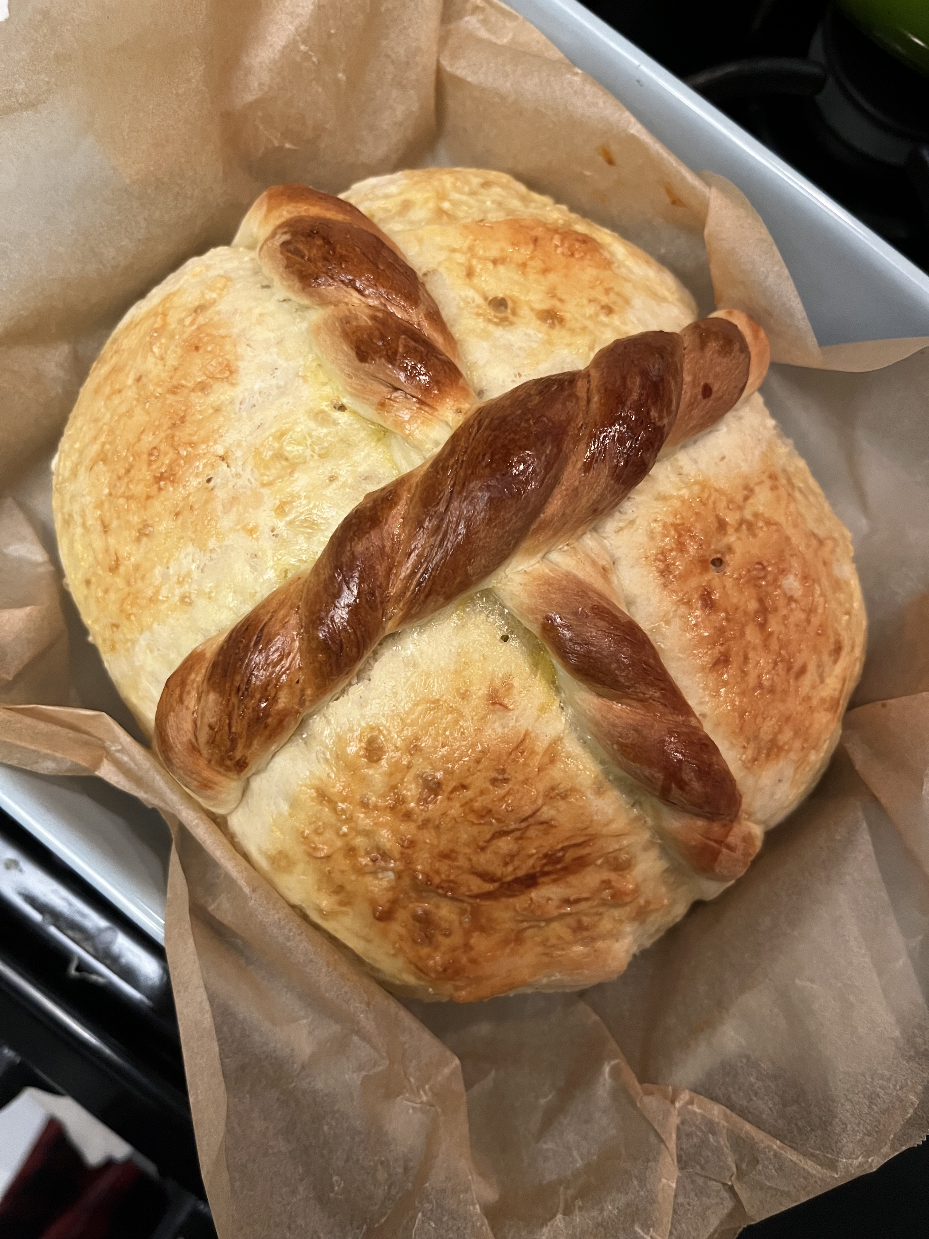 Combine 2.5 c. flour, 1.5 tsp active dry yeast, 2 tbsp sugar, and 1/2 tsp salt in a large bowl. Pour in 1/2 c. warm – not hot – milk, 1 tbsp warm water, 1 egg, and 1/2 stick (55 g.) softened butter. Stir with a wooden spoon before turning it out onto a floured surface to finish working it into a smooth dough with your hands. It’s done when the dough doesn’t stick and feels a bit elastic. Put the ball of dough back into the bowl, cover with plastic wrap, and let it rise for an hour. Halfway through, knead it a little. Once it’s done rising (and mine didn’t get huge), pull off a piece of dough about the size of an egg. Then, divide that into four pieces and roll into snakes. Pair off your snakes and twist each group of two so you have 2 two-strand “braids” that you can lay over the top of your ball of dough like a cross. Put the whole thing into a parchment paper-lined and greased baking dish, cover with a kitchen towel, and let it rise for another hour. Brush it with an egg wash and bake at 350 for 25-30 minutes.