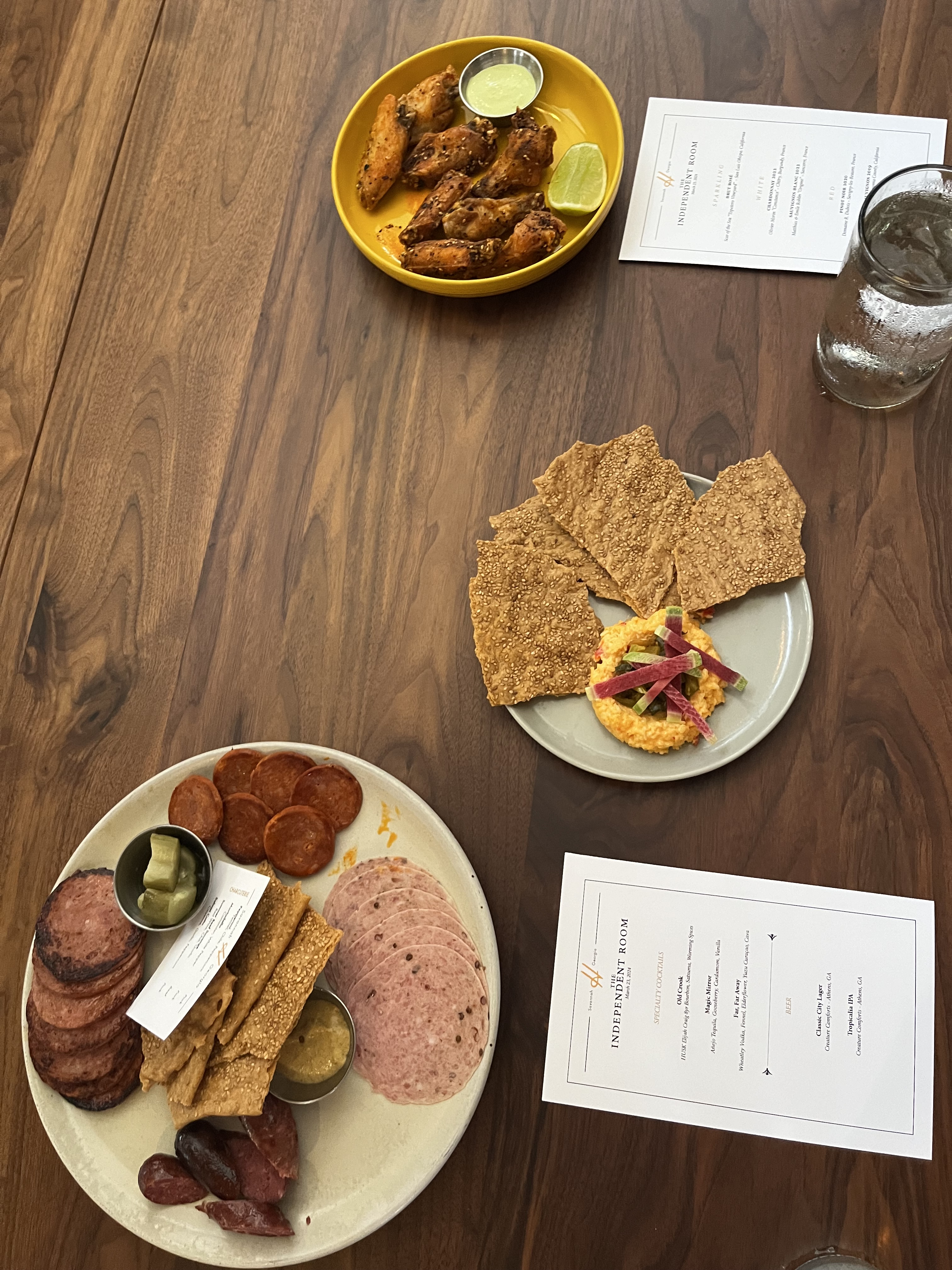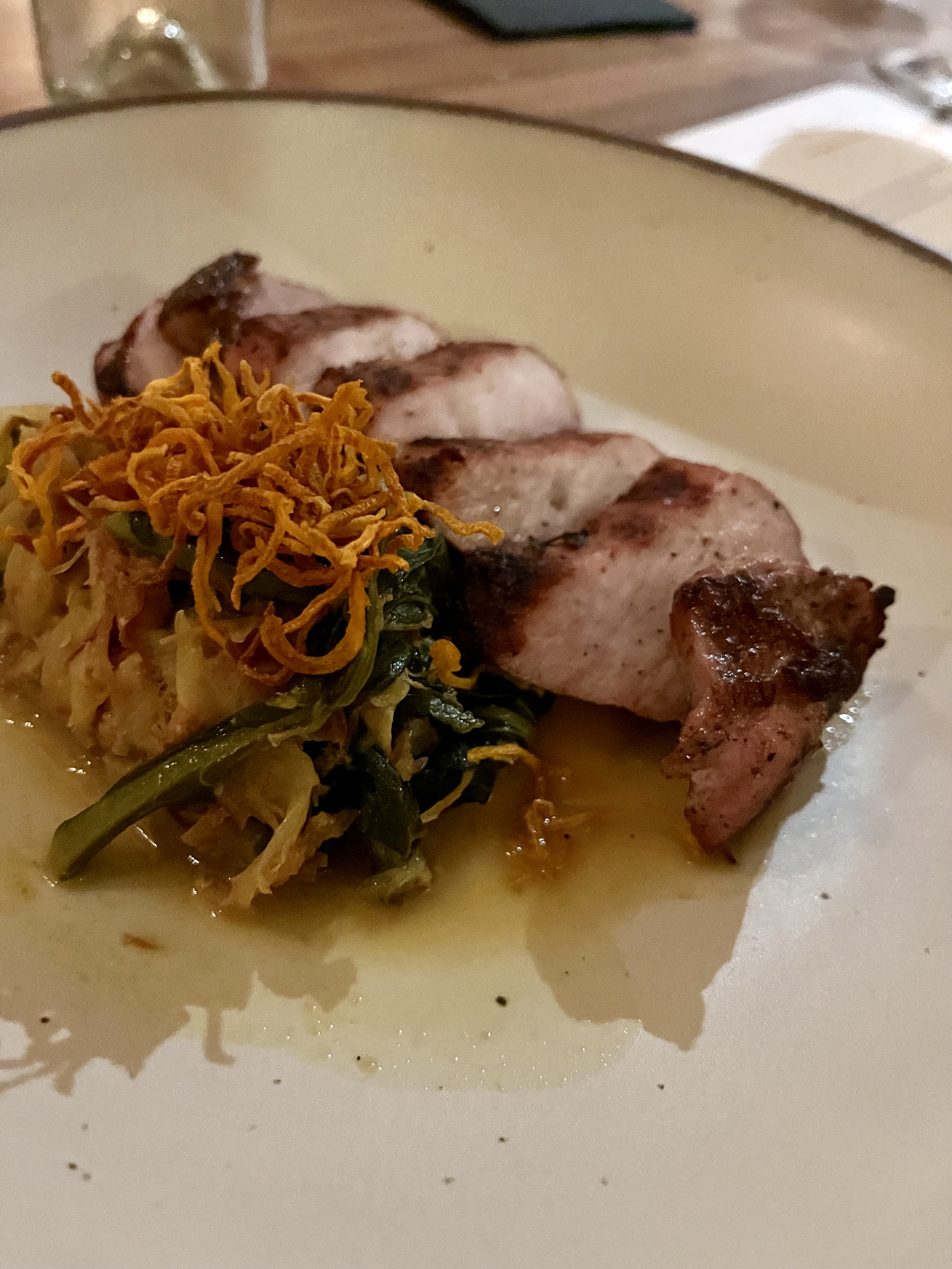 The appetizer selection was great because it was varied. Pimento cheese was stellar and (!) were those pickled greens on top? Because that was a genius touch. I waited til the last minute to try the chicken wings because I didn’t want to eat them in front of people in my fancy dress but finally said what the heck we’re all friends here. Glad I did because they remained crispy and I would have been happy to guzzle that sauce in place of a cocktail it was so good. And the meats! I know my husband was happy to see those platters. I’m feeling positive they were house-made and they were delicious. Honestly, aside from imported Iberico ham or aged prociutto de parma (which feel like a different category), these are some of the best meats I’ve had on a charcuterie platter. After the apps, we were each served a salad of winter lettuces that was tossed in a really nice, herbaceous dressing.