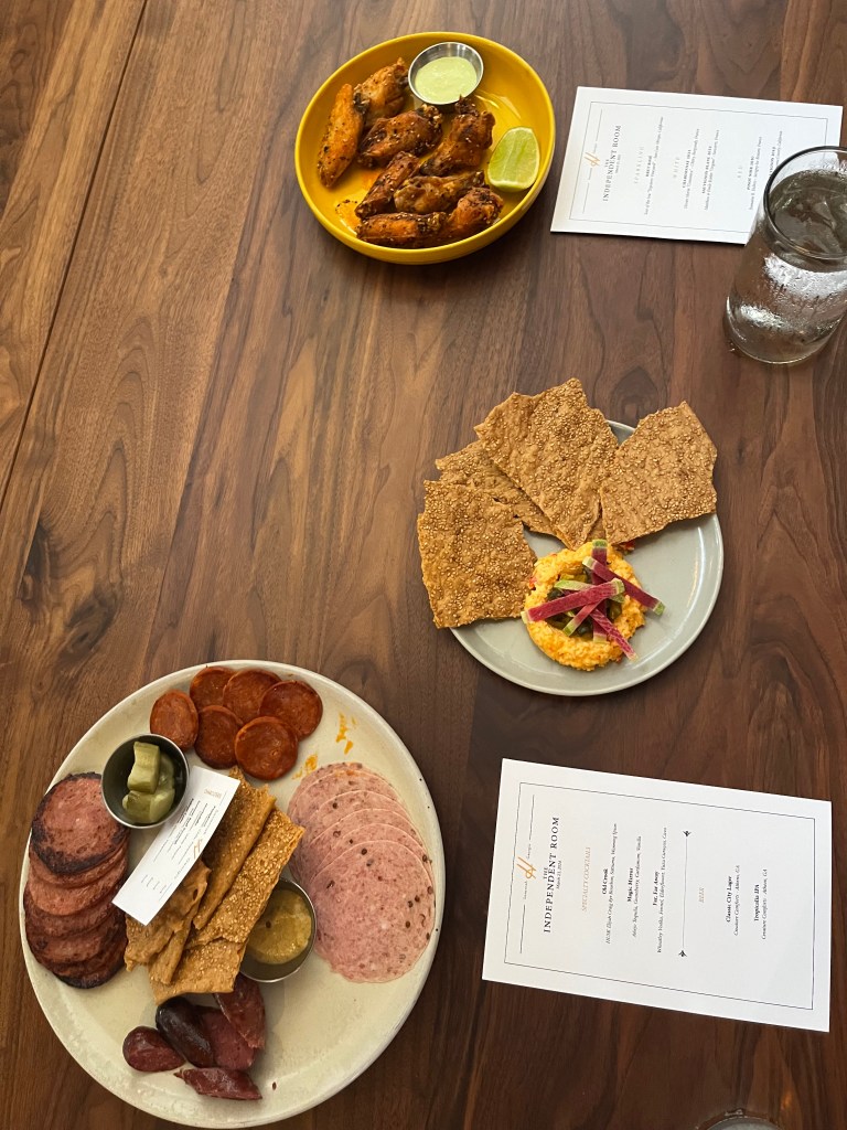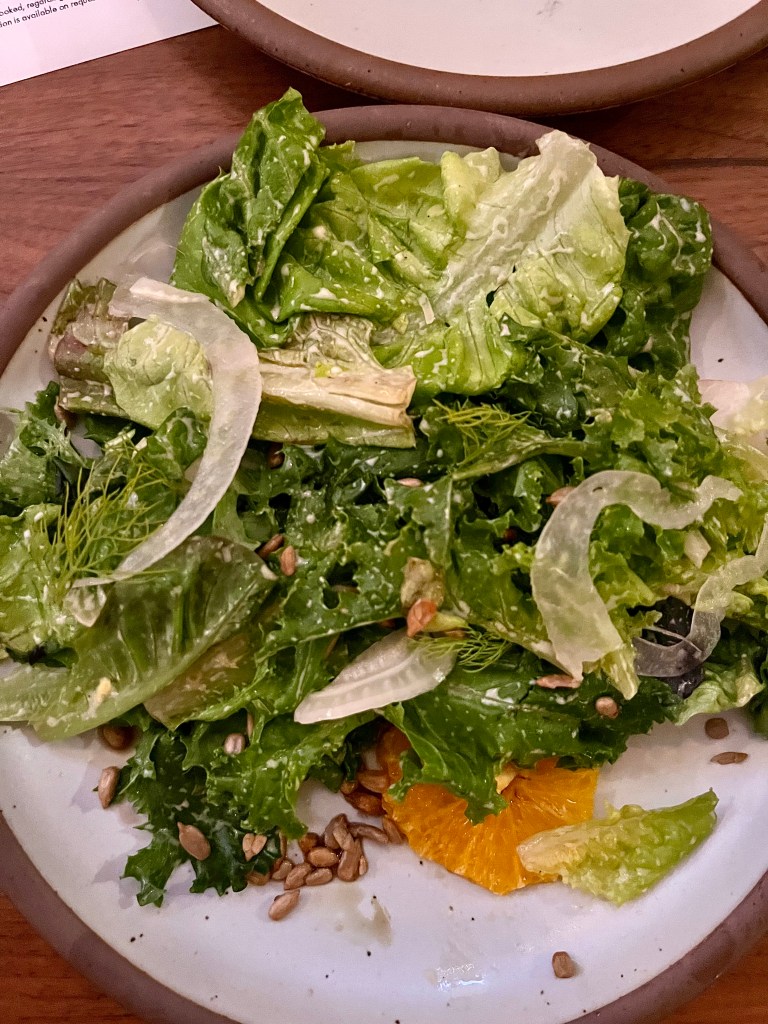 The appetizer selection was great because it was varied. Pimento cheese was stellar and (!) were those pickled greens on top? Because that was a genius touch. I waited til the last minute to try the chicken wings because I didn’t want to eat them in front of people in my fancy dress but finally said what the heck we’re all friends here. Glad I did because they remained crispy and I would have been happy to guzzle that sauce in place of a cocktail it was so good. And the meats! I know my husband was happy to see those platters. I’m feeling positive they were house-made and they were delicious. Honestly, aside from imported Iberico ham or aged prociutto de parma (which feel like a different category), these are some of the best meats I’ve had on a charcuterie platter. After the apps, we were each served a salad of winter lettuces that was tossed in a really nice, herbaceous dressing.