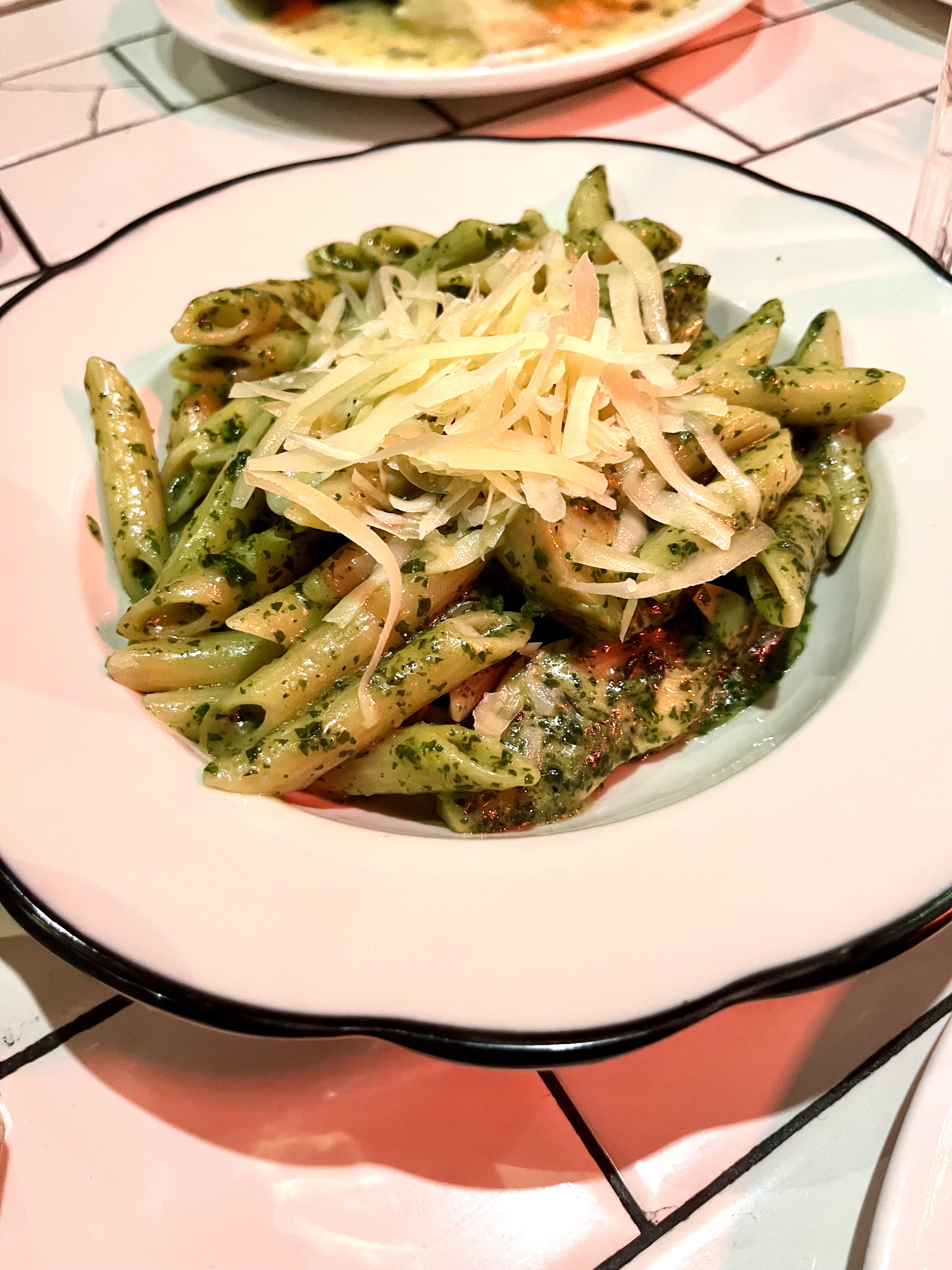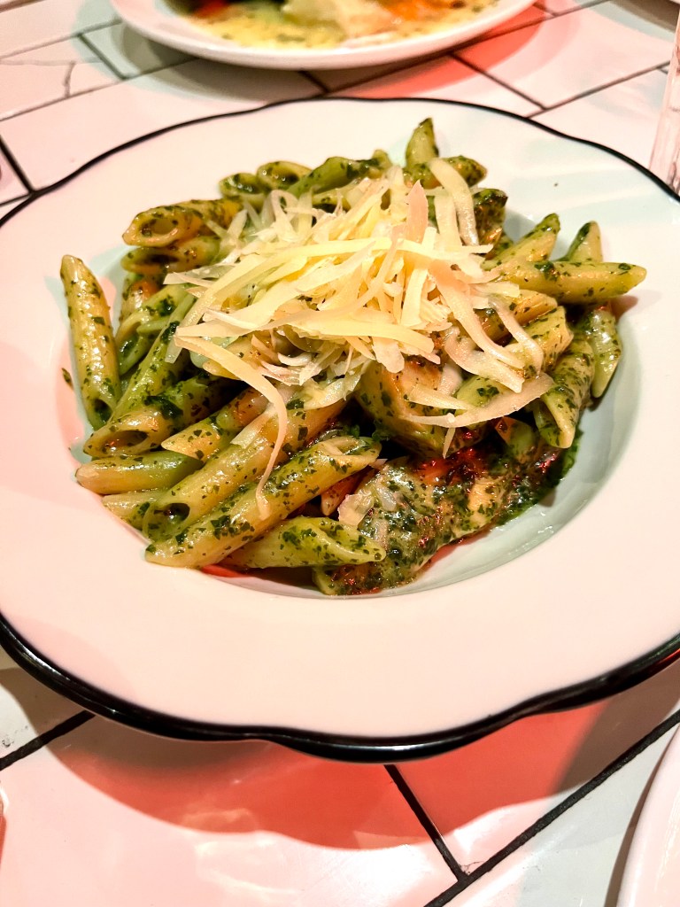It was late on a Wednesday night after a Broadway show so we weren’t looking to hardcore booze and feast. A glass of wine and a lil something to share is all we needed. There was a burrata special so you can bet we ordered that. Served with tomato and prosciutto, it was exactly what we wanted. We also split a pesto penne with artichokes. It would be easy to top this with a protein if you’re looking for something a bit more substantial, but we didn’t need anything too heavy at such a late hour. I did, however, love the addition of artichokes. You don’t see them all that often in a pasta dish (when you do it’s always a light tomato sauce) and I like the tang.