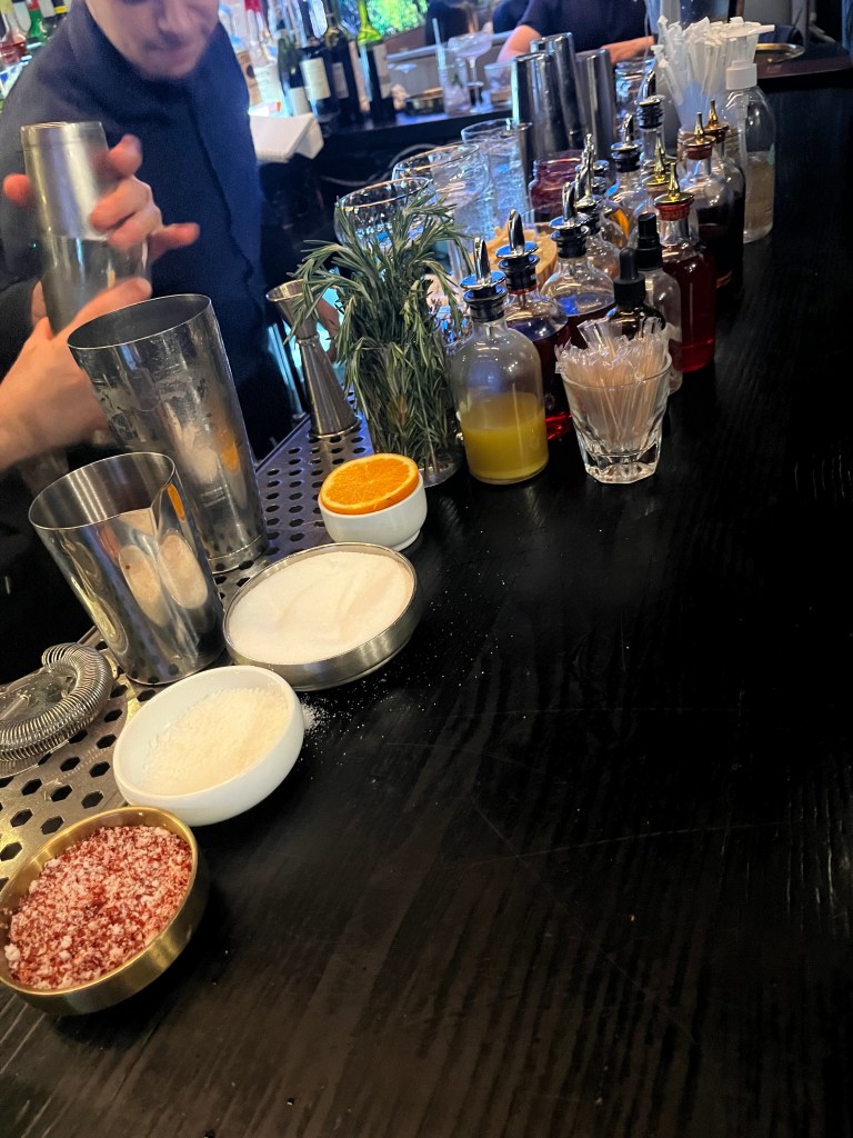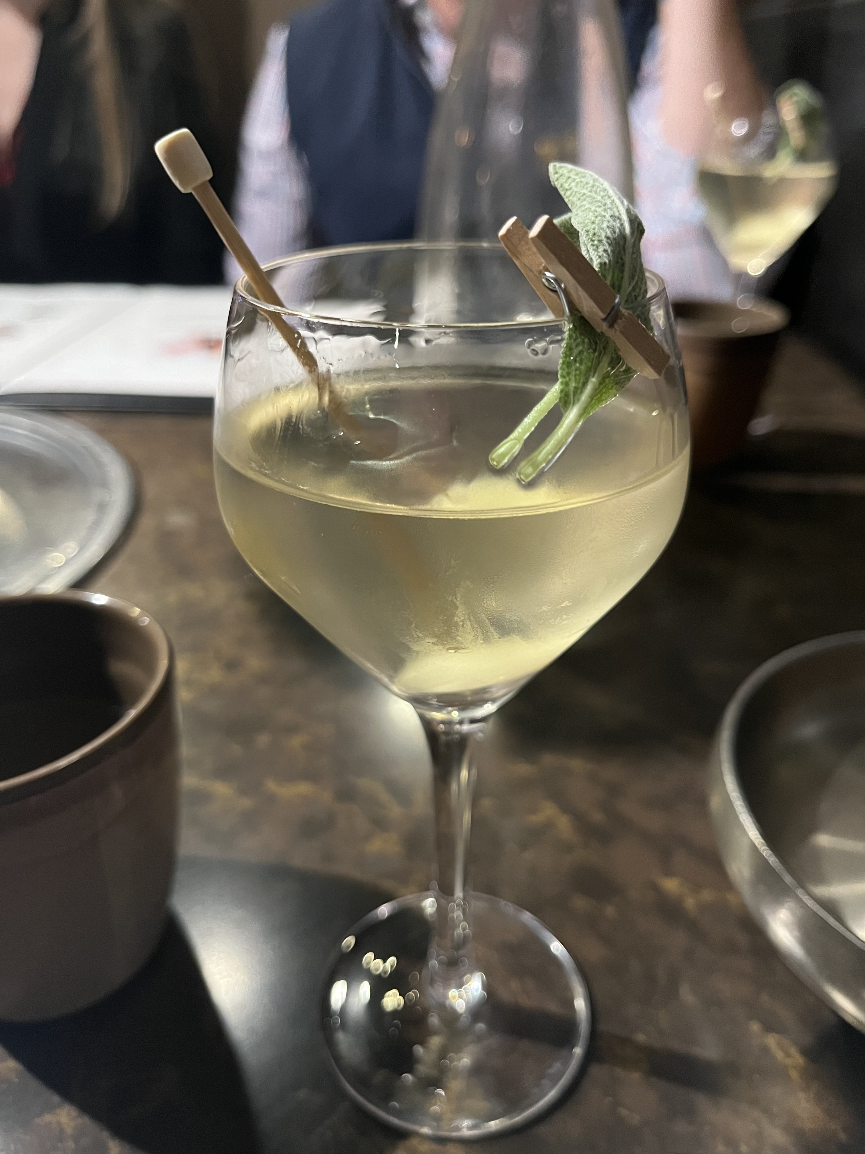 The first thing I noticed when I entered was the bar. I spied some good looking garnishes and knew I’d be starting with a cocktail. I went with the sage martini (vodka, vermouth, sage, yuzu, and umami bitters) and later switched to wine and soju. I absolutely love a cocktail with a mini clothespin. This one was quite tasty.
