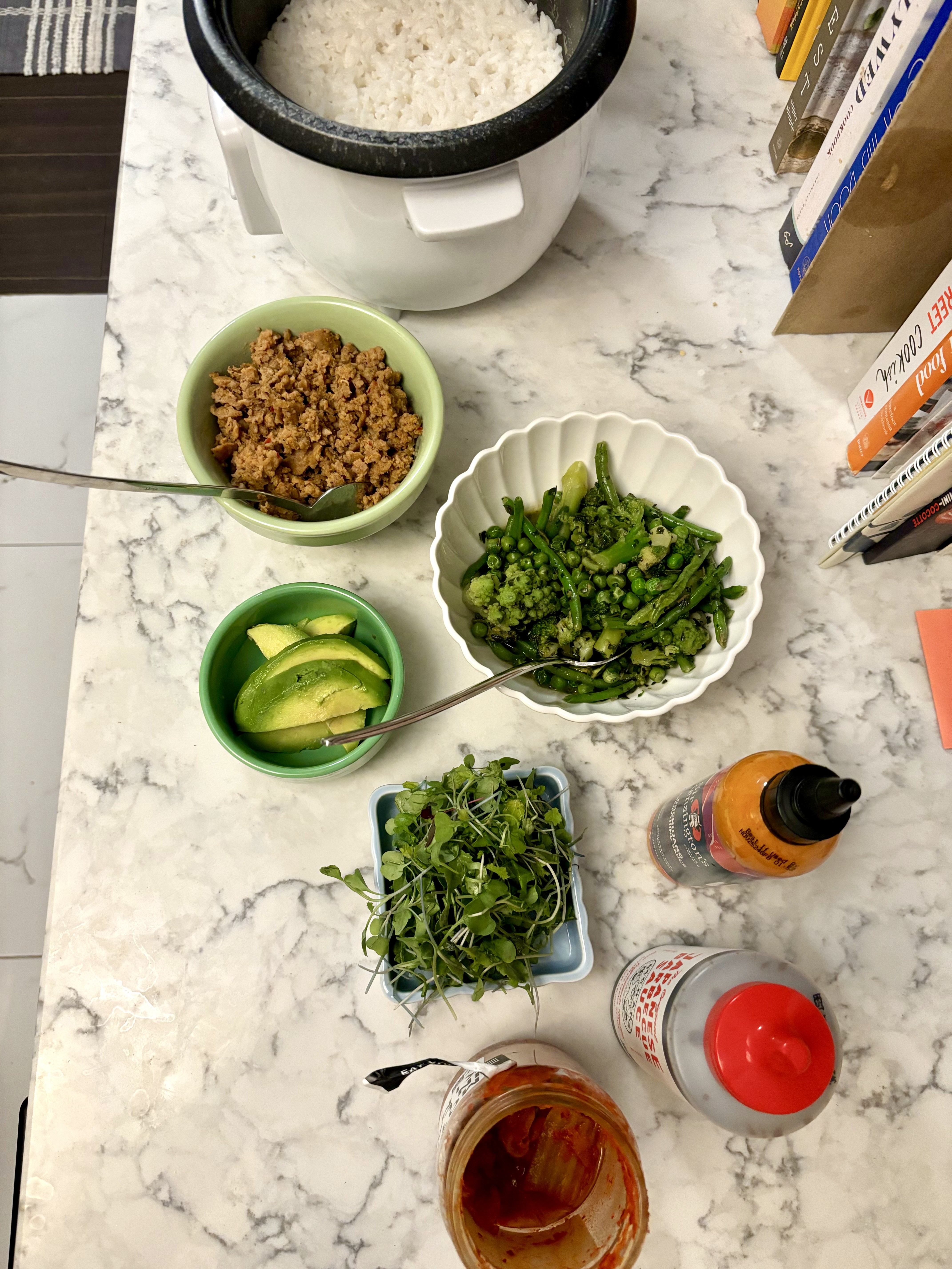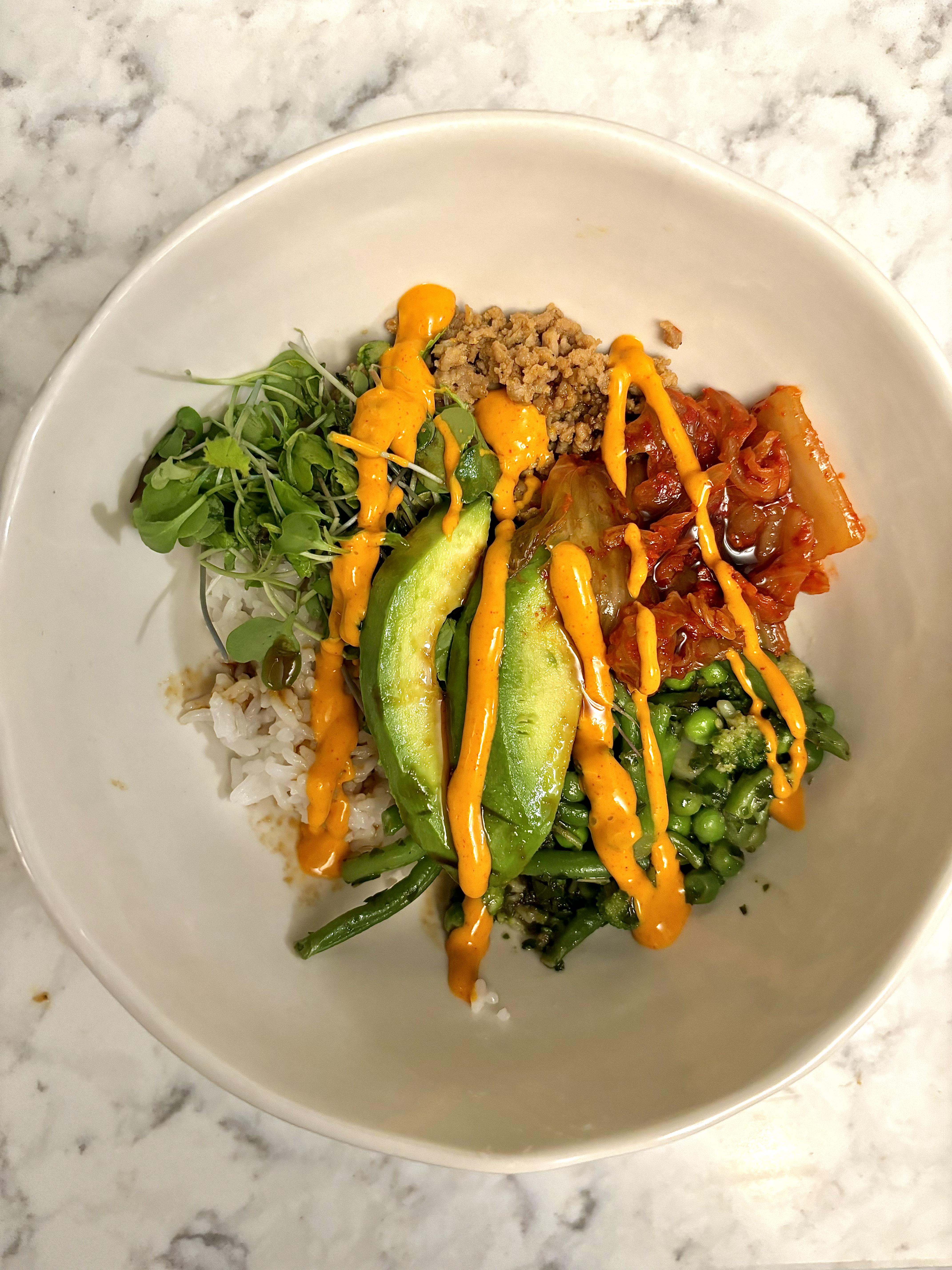 Get some rice cooking in your cooker and while that does it’s thing, remove the sausage from it’s casing, crumble it, and brown it. Once that’s done, drain it on a paper towel and set out all your accoutrements: some green veggies (I used the steam-in-bag European blend from Whole Foods), kimchi (whatever brand you prefer), micro greens, slided avocado, Sir Kensingtons gochujang sauce, and Bachan’s Japanese bbq sauce.