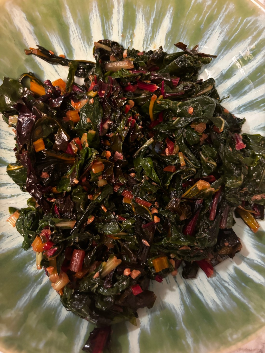 Basically just sauté chopped rainbow chard in oil with a TON of minced garlic. As it’s finishing up, drizzle in some truffle oil and a hefty handful of grated Parmesan. That’s it!