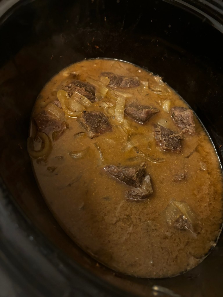 Place the cubes of water buffalo onto the slow cooker with a sliced onion. Make a broth by using packaged stock or Better Than Bouillon – at least a cup, depending on how much meat you’re cooking – and stirring in a large squeeze of Dijon, some agave, and a hefty sprinkle of thyme. Add the broth to the crock pot and cook on high for 3.5 hours. With about 30 minutes left, pull out some of the broth and mix with corn starch to make a slurry that you’ll then pour back into the slow cooker.