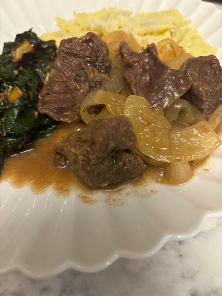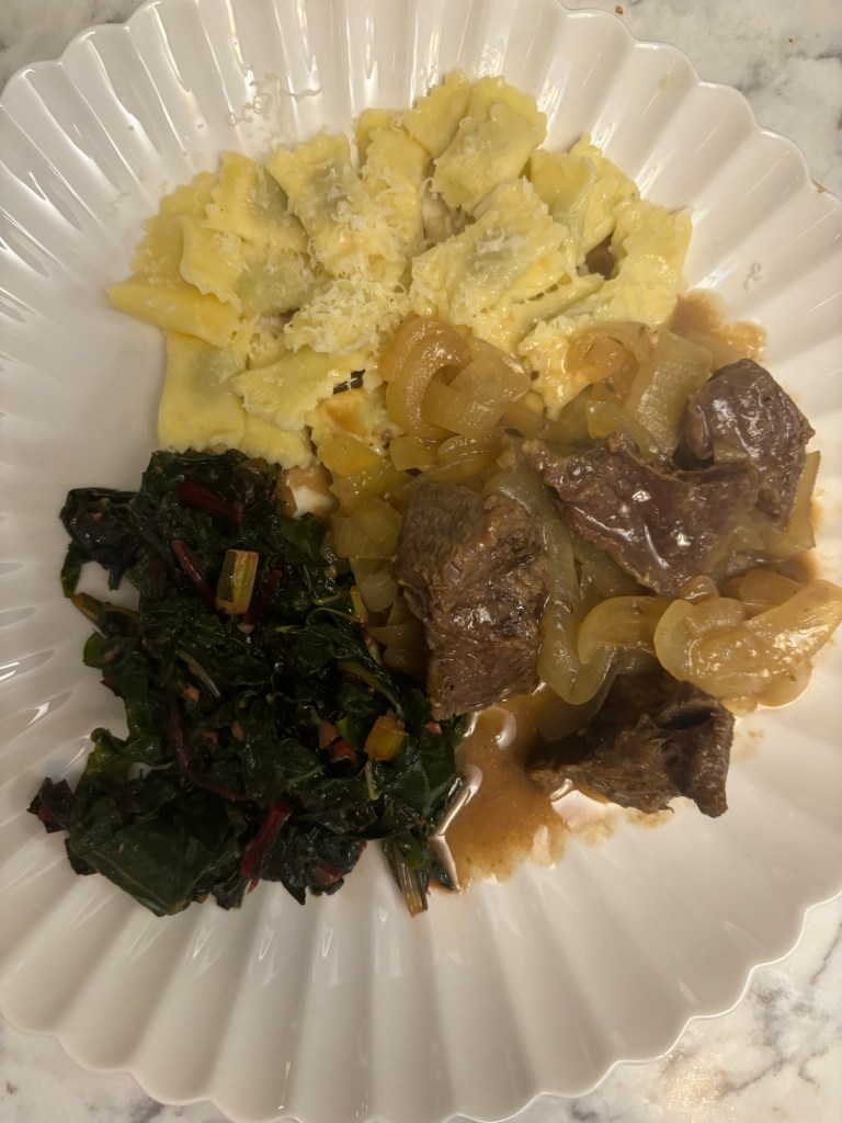Serve with agnolotti (with parm and butter on top) and rainbow chard. All the components of the meal work well separately, but they’re also great when layered together. If you’re like me and love the idea of stew – especially in this weather – but don’t really get all that excited about the traditional flavors or carrot/potato vibe, this is a great update.