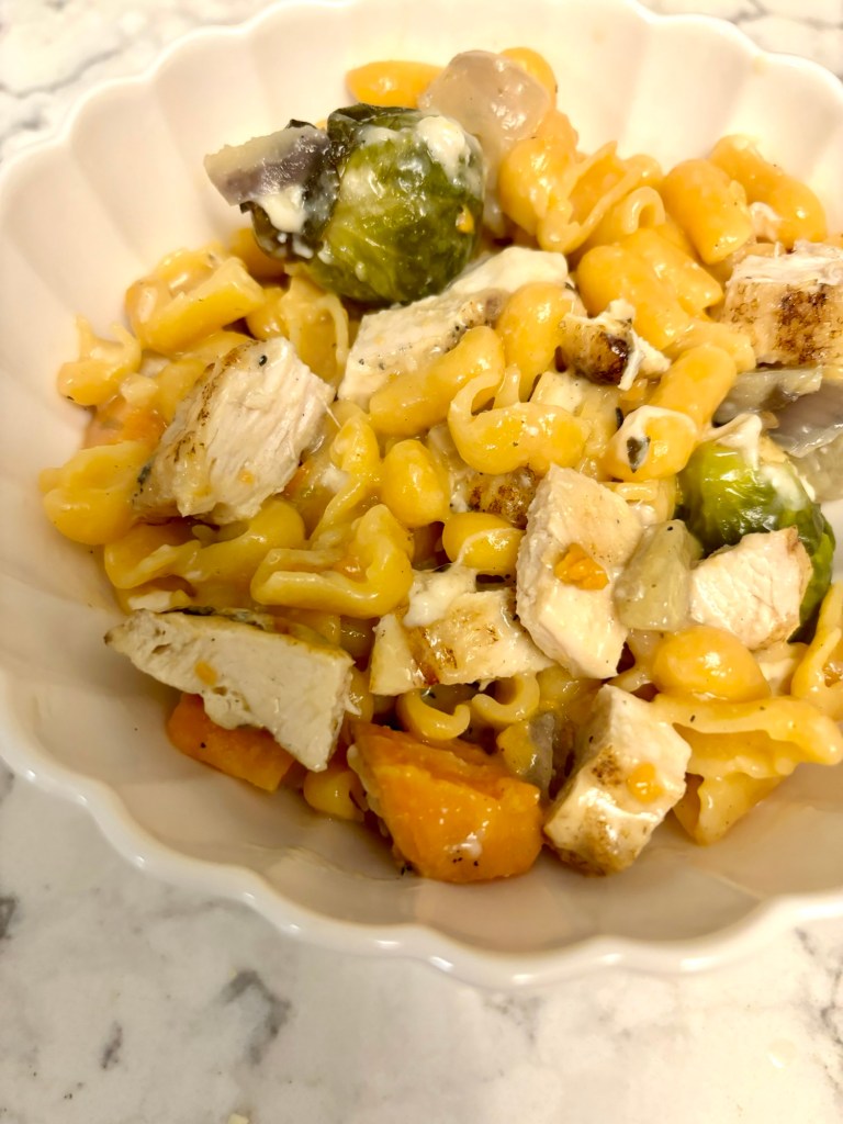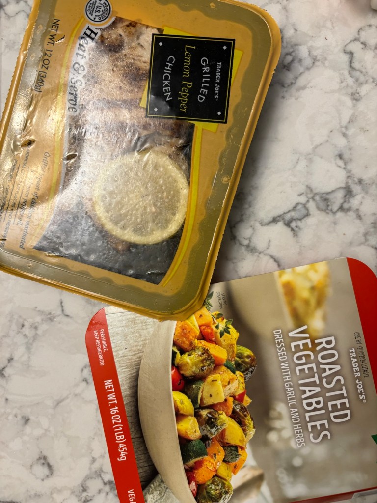 This one with leveraged their lemon pepper chicken and veggies in garlic medley (both from the refrigerator section, though the veggies are seasonal for fall). I tossed it all with a large macaroni-ish pasta and made a sauce using TJ’s walnut Gouda (grated) that I mixed with milk, smoked maldon, and pepper and simmered in a sauce pan.