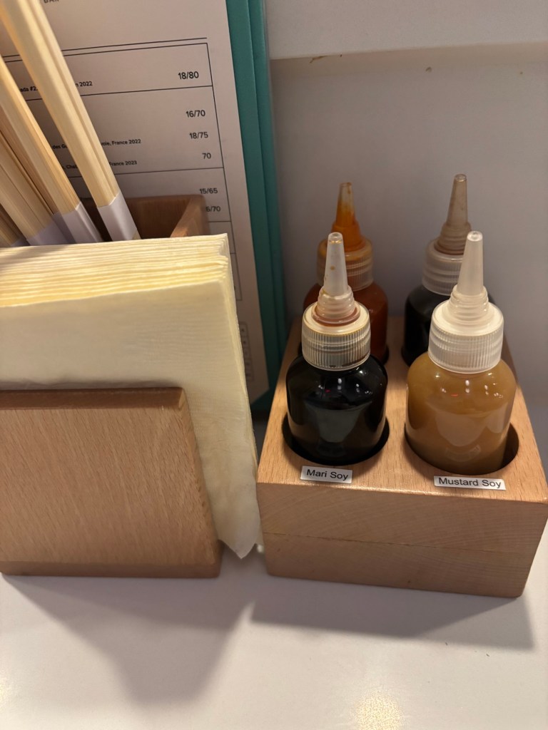 The first time I went I got the standard 5 hand rolls…and then added 3 more. I probably should have just added 2 more, but I couldn’t pass up the uni. The standard 5 ($32) are fatty tuna, salon, yellowtail, shrimp, and spicy tuna. All are good and all are dressed nicely without overpowering the fish. I love a sauce, so I had fun drizzling one of the 4 house made ones in all sorts of combos, particularly the mustard soy. And aren’t those bottles the cutest?! Pricing is on point too: if you do the 5 handrolls and add a little extra, you’ll wind up spending $50-$60 on food and be very satisfied. Not bad for this type of meal. And by this type, I mean one that comes from a chef who’s nabbed himself two Michelin stars. (And if you have vegan friends, they’ve got some good options, FYI.)