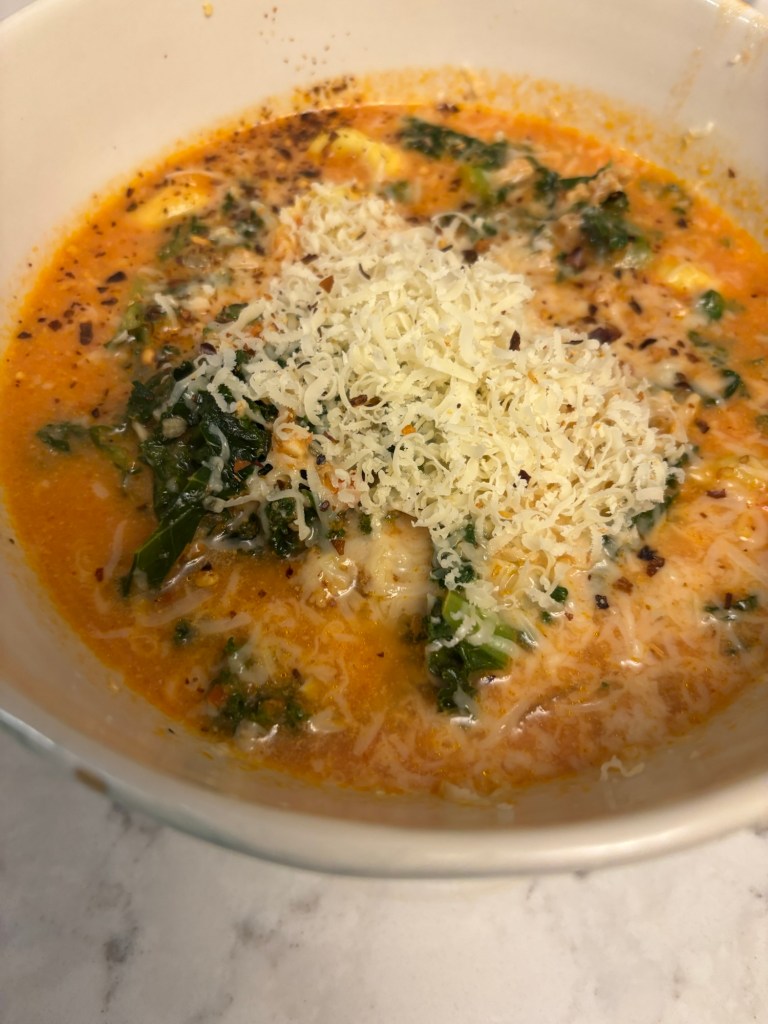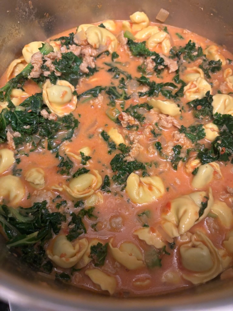Over medium-high heat, cook 1 lb of sweet Italian sausage (remove from casing and break apart as cooks), 1 chopped onion, and and 6 gloves of minced garlic until the meat is browned (about 5 min). Whisk in 1 quart of chicken stock, 1 (14-oz) can of crushed tomatoes, and 2 tbsp of tomato paste. Bring the whole thing to a boil, salt it up, and turn the temp down to a simmer for at least 15 minutes so the soup can reduce. Now add 1 bag or bunch of chopped kale, 1 package of your favorite tortellini, and 1 cup of heavy cream. Cook for as long as the tortellini package suggests (usually 3 min), which should also be enough time to wilt the kale. Just after spooning this into deep bowls, top with fresh grated Parmesan and a sprinkle of red pepper flakes.