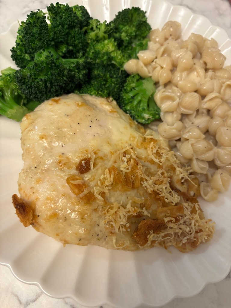 Place boneless skinless chicken breasts in a baking dish, top each piece with slices of provolone (making sure the chicken is fully covered because you’re going to want that cheese pull later), pour your favorite Caesar dressing over the top, and then sprinkle on a grated Parmesan and crushed crouton topping. Bake at 350 for about 35 minutes (depending on how thick your chicken is).