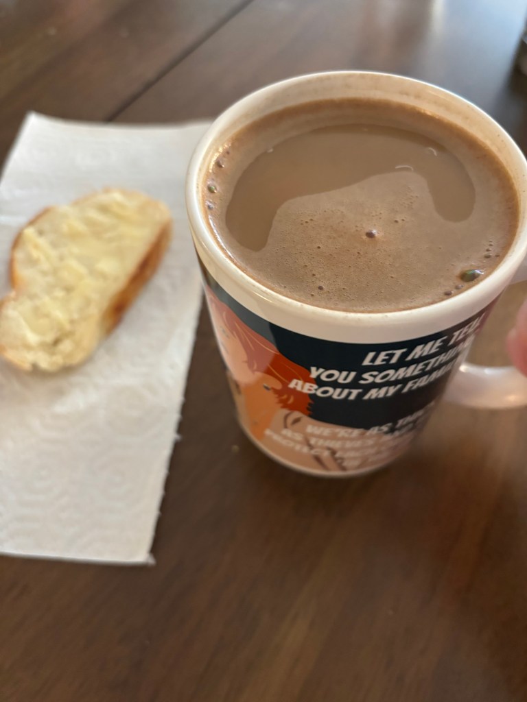 V requests challah most Fridays, which means I have a lovely little breakfast on Saturday and Sunday mornings. I got myself set up with a fresh cup of coffee and challah with butter on a paper towel (always on a paper towel, I don’t make the rules), remarked that it felt calm and blissful, and then I realized I have completed the transition to becoming my mother. (There may or may not have been a Kleenex stuffed into the sleeve/pocket of my bathrobe.)