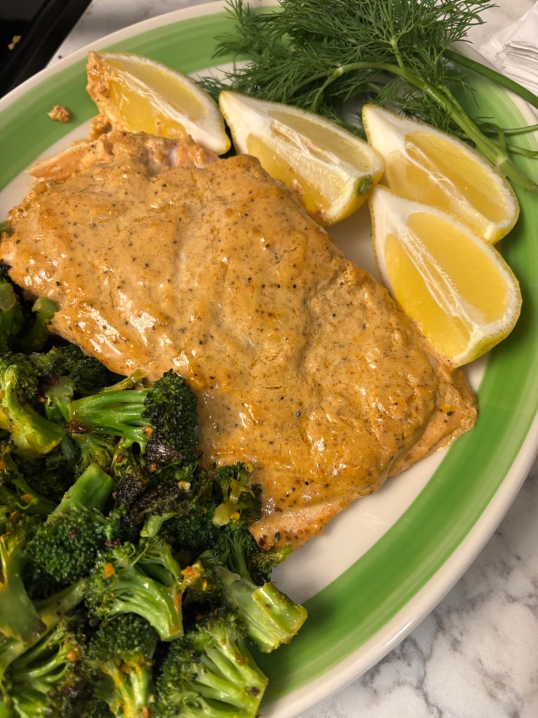 In a large bowl, combine 1/2 c. plain Greek yogurt, 2 tbsp olive oil, 1 tbsp Dijon mustard, 1 tbsp brown sugar, 2 tsp fresh ginger (I only had powder so I guesstimated an appropriate amount), 2 cloves of garlic (grated), 1 tsp paprika, 1 teaspoon salt and ½ teaspoon pepper, and whisk until smooth. Add 4 6-oz salmon fillets and get them fully coated with the yogurt mixture. Let the salmon settle in the fridge for 1-24 hours (but no longer to avoid the dish getting mealy). Bake the fish at 375 on a lined sheet for 10-12 min (though if you have a thick piece like me, you could need double that). The recipe suggests finishing off in the broiler but I didn’t feel like setting off my smoke alarm – still worked. Serve with a bunch of fresh dill and quartered lemon.