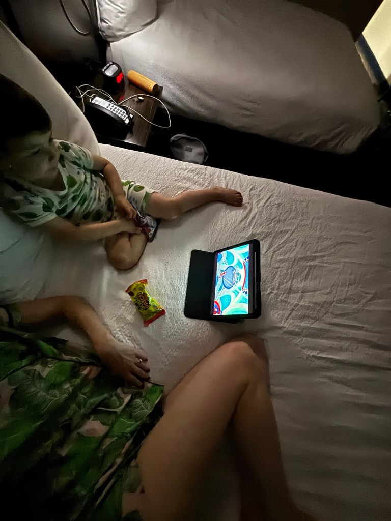 Last weekend marked the first time V has stayed in a hotel since switching to a big boy bed. Figuring out bedtime routine when everyone is staying in the same room but have wildly different bedtimes was interesting, but we made it work. (Hit me up for tips, I feel like I’ve got it down.) Even though we were staying in a hotel for a sad reason, I wanted Finn’s general experience to be one marked by happiness so we made a little bed picnic. We watched one of his favorite shows while eating a little candy and it was just a cool moment of him turning into a kid before my very eyes. Trips and hotel stays were a favorite part of my childhood, and I want him to have similar fond memories.