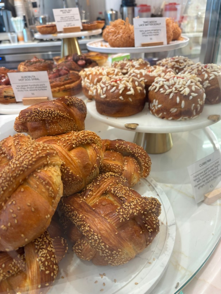 I truly did order a ton, but it was research, right? I got the taro mochi lace batter donut (taro, guava strawberry jam, vanilla mochi), the kurobuta hot dog spiral (soy-glazed Kurobuta pork hot dogs, sticky rice, sesame urikake), the scallion basil blossom (scallion & Thai basil pinenut pesto, toasted sesame), the banana bread Malay cake, the pretzel salt egg tart (egg custard, sablé, crunchy pretzel salt, brown butter), and the avocado cucumber sando (avocado, baby cucumbers, garlic kewpie, sesame oil, yuzu ponzu vinaigrette).