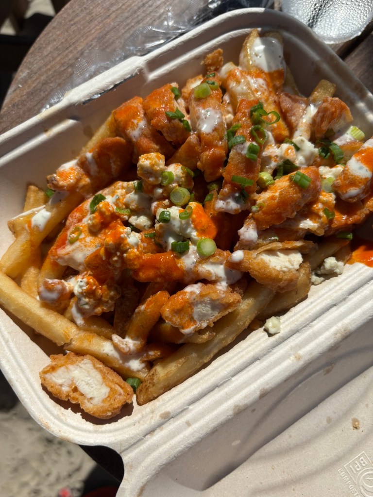 I had a Hugo spritz and when we needed a little something to eat, we ordered some fries to share. They have an entire fry menu, loaded up all sorts of ways, like the buff chick version we got. I spied the lobster roll walking around and have to say it looked good.