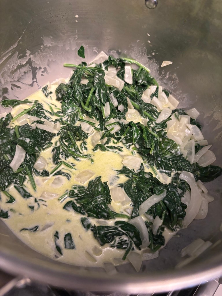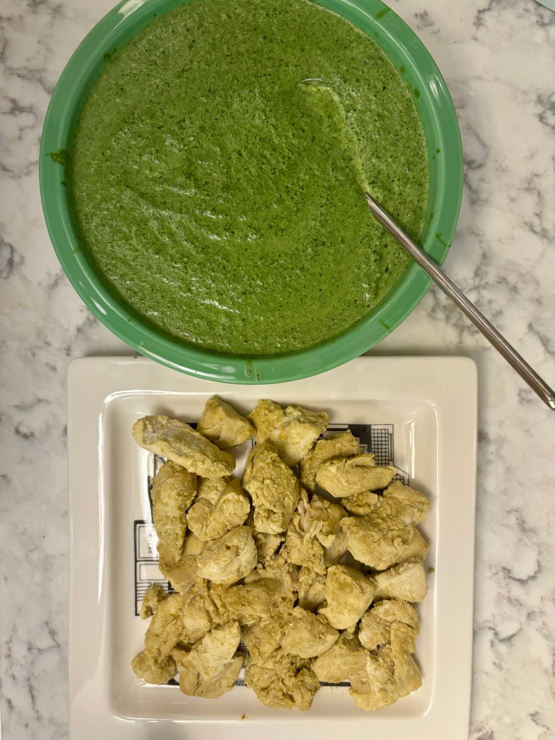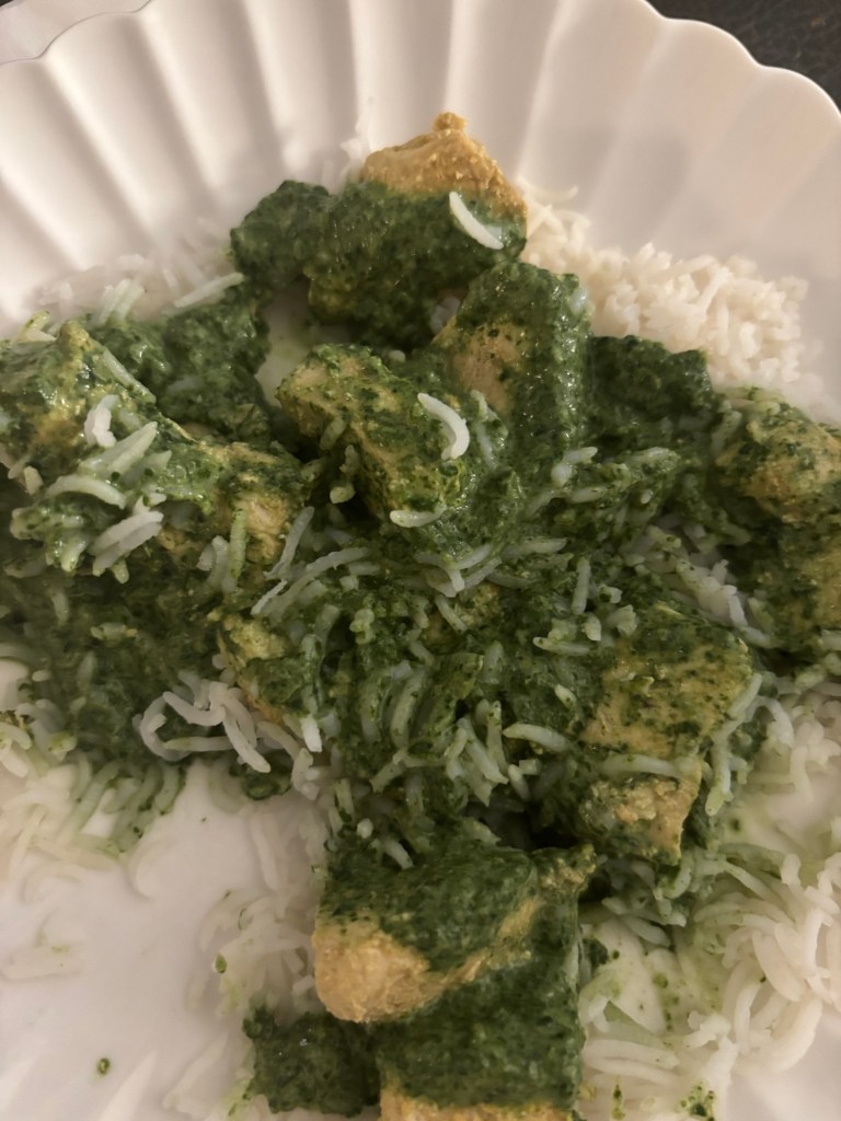 I started by simmering onions in oil in a large pot. Once they were translucent, I added a bag of fresh spinach and let it wilt before adding some milk, salt, and a heavy dose of the palaak spice blend. Once the flavors settled, I used an immersion blender to turn it into a smooth, green sauce. Set the sauce aside and cook up your chicken (boneless skinless breasts cut into 1-inch pieces that have been coated with the same spice blend + salt) in a pan with oil. You may also consider marinating the chicken bites in Greek yogurt with the spice blend and salt and baking in the oven. I didn’t have the time for that but may try it next time.