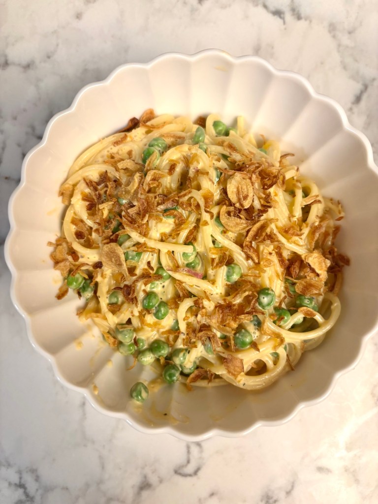 Boil your spaghetti and when it’s done, start melting the pizza cream cheese. Add some of the pasta water and a bit of salt, along with frozen peas. The sauce will become saucy just as the peas get warmed through. Use tongs to add the spaghetti to the pan and crack some black pepper in there. Maybe some red pepper flakes. Chopped pepperoni would be great, but not necessary. Get it into a serving dish and top with a mound of fried shallots (also from TJ’s).