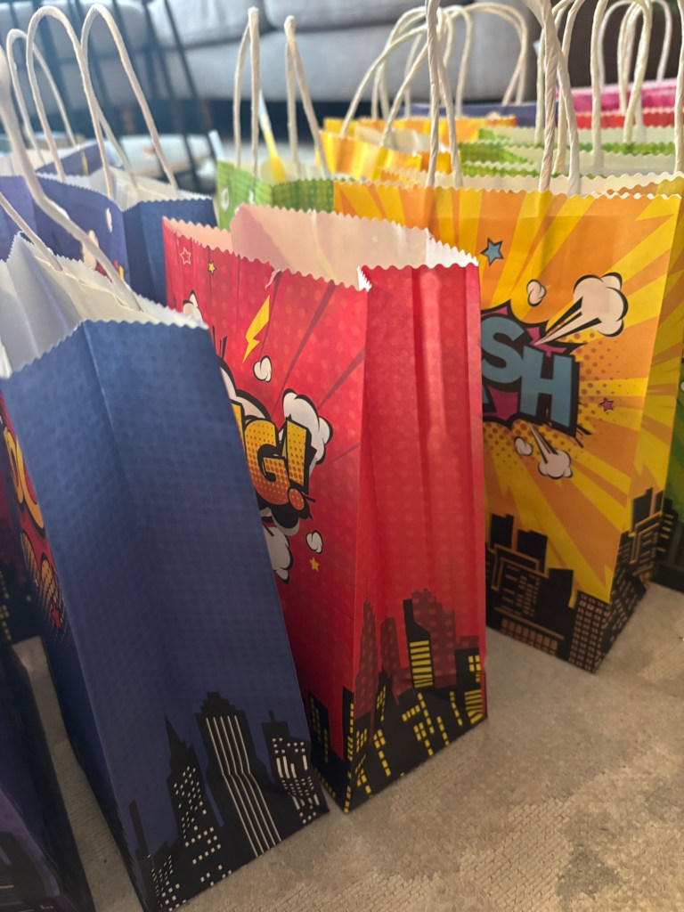 - The Theme: Finn was very clear that he wanted a superhero party. Since he loves so many different superheroes, this was a general “super” vibe. He decided he wanted to be the Hulk so he wore this outfit and was very proud.