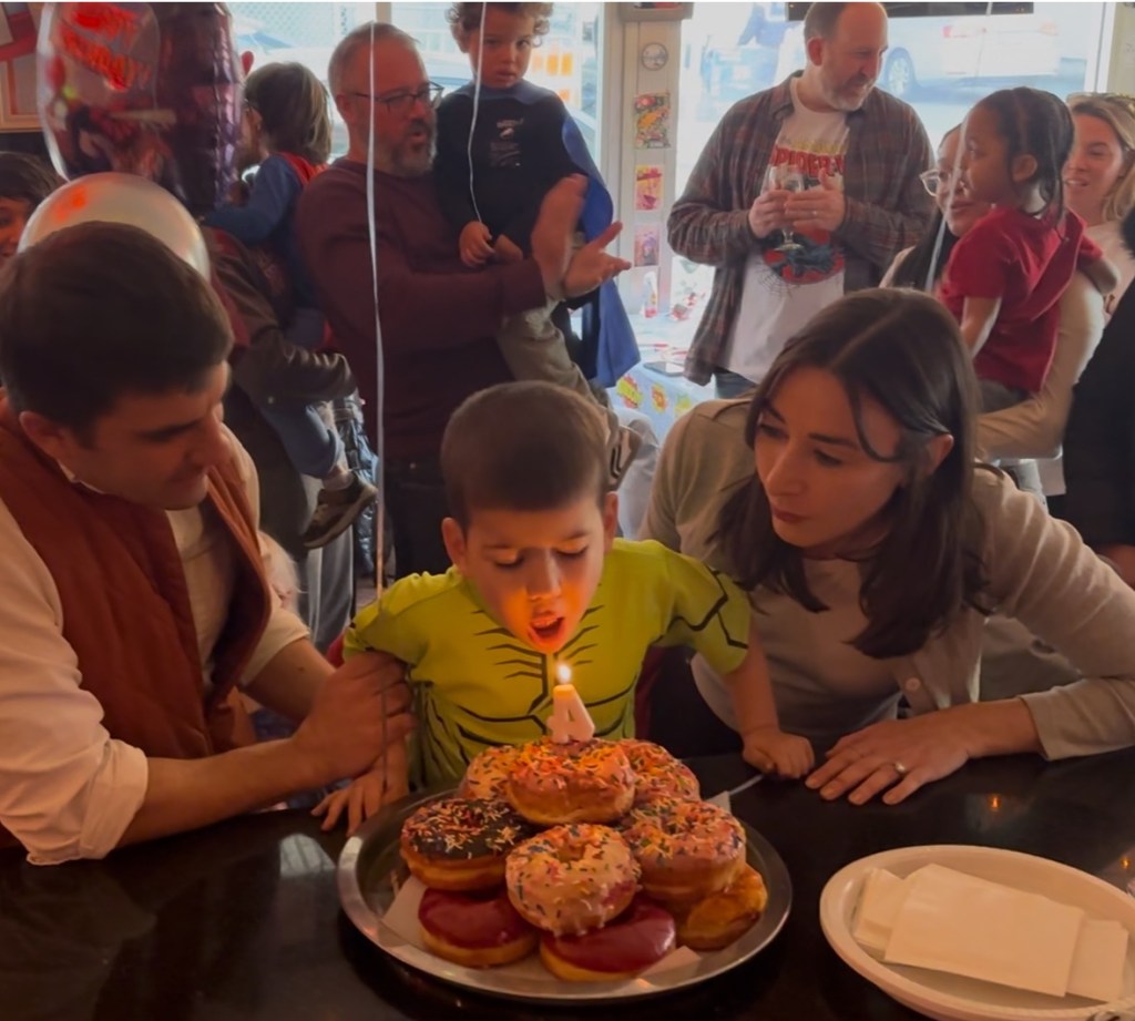 - Finn isn’t big on cake/cupcakes. He likes it in theory but won’t even take a bite once it’s in front of him. When I told him he could have doughnuts if he wanted – it’s his birthday – he loved the idea. We made a tower and stuck a Spiderman candle in the top one, which happened to be his favorite strawberry with sprinkles.