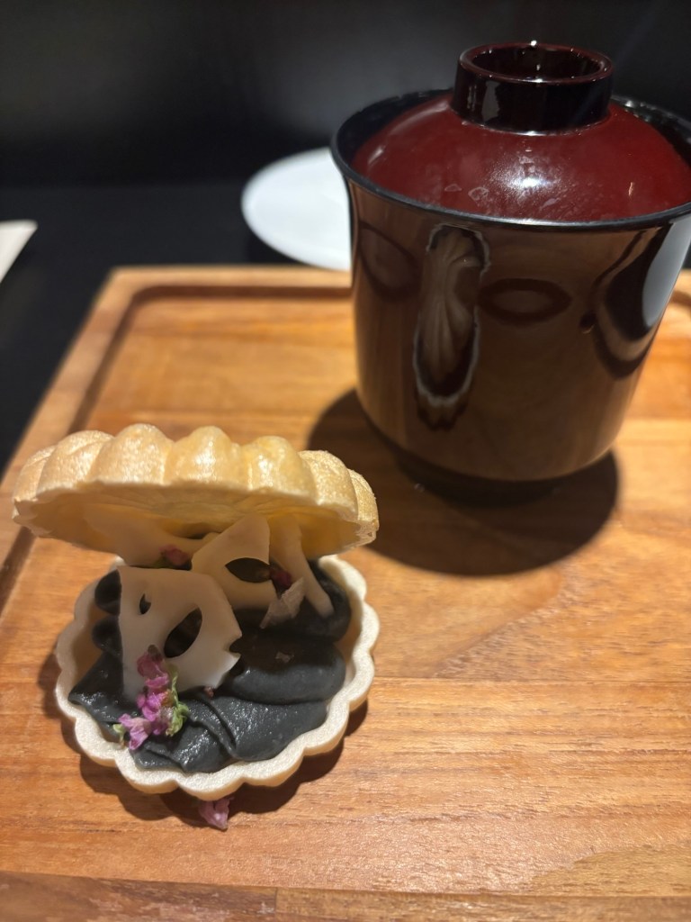 You start with two appetizer courses. The first is black sweet potato puree with lotus root and a soup with generous nori. Next, there are two hand rolls: tuna and baked crab. With the presentation here you’re introduced to the theme of the evening: juxtaposition of old and new school. With each course, they showcase both traditional and modern takes on both flavor and preparation.