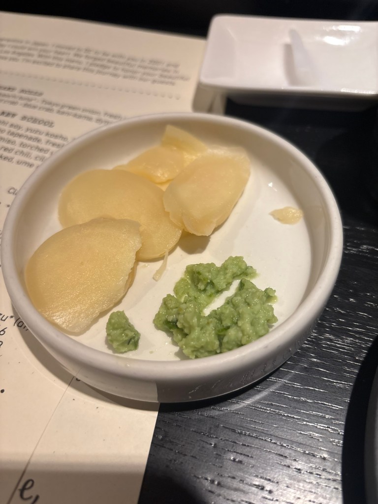 The it’s onto the nigiri courses, but first a moment for the wasabi that was so fresh and clearly hand mashed. It may be odd to be so impressed by horseradish, but here we are. For the nigiri, each type of fish (5 in the standard option, 7 in the supersized) is served two ways: old school and new school. Old school treatment has soy, ponzu, sesame; new school is garnished with things like bottarga, hay smoke, and the heat of a blowtorch. I can’t remember which was my favorite – everything was good – but I do recall really liking the salmon and o-toro.