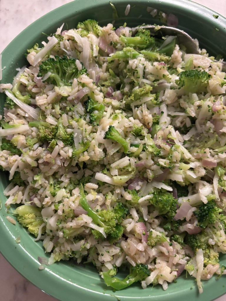 Sauté chopped red onion until it’s nice and soft and lost that sharpness. While that’s going, grate some cheddar (I used a goat cheese cheddar from TJ’s but any will do). Next, microwave your two main ingredients: 90-second cilantro rice from Target (Good & Gather) and a bag of broccoli florets (2-3 min so it steams). Toss it all together with some salt and pepper, and it turns into a creamy, ultra satisfying side that’s perfect with chicken.