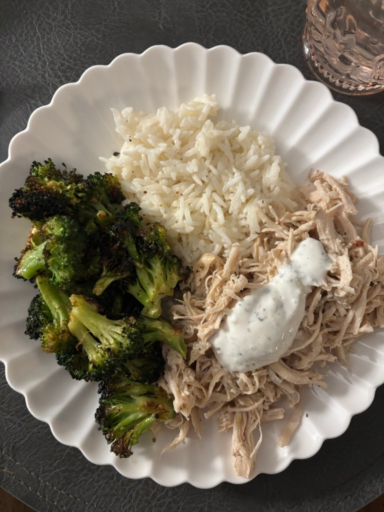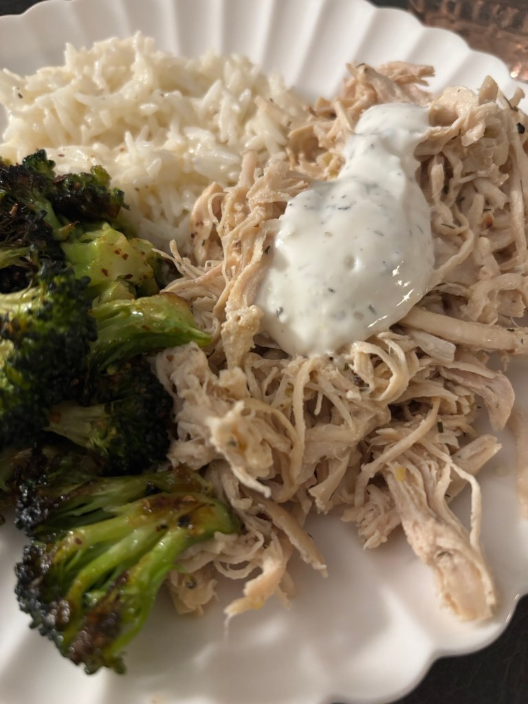 Make a marinade of plain Greek yogurt + garlic + salt pepper + dill + oregano. Place boneless skinless chicken breasts in a slow cooker with 1/3 of marinade while it cooks for 3-4 hours on high. Add another 1/3 of the marinade in the last 5 min, and, finally, use 1/3 as a sauce when serving. I also squeezed some lemon over it just before serving and added some slices to the plate. I think it works really well when served with rice that’s mixed with butter, salt pepper, and plentyyy of grated parm. It gets nice and creamy.