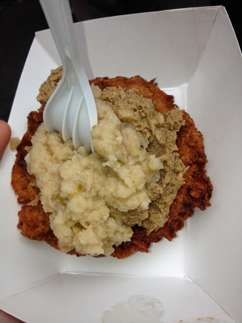 My final stop at the “Taste of Jewish Culture” street fair was Peck’s where I sampled pierogis. They were huge and only $4 for two of them so I would have to say it was the best deal of the day. I decided to get one of each flavor: the kasha and mushroom as well as the…